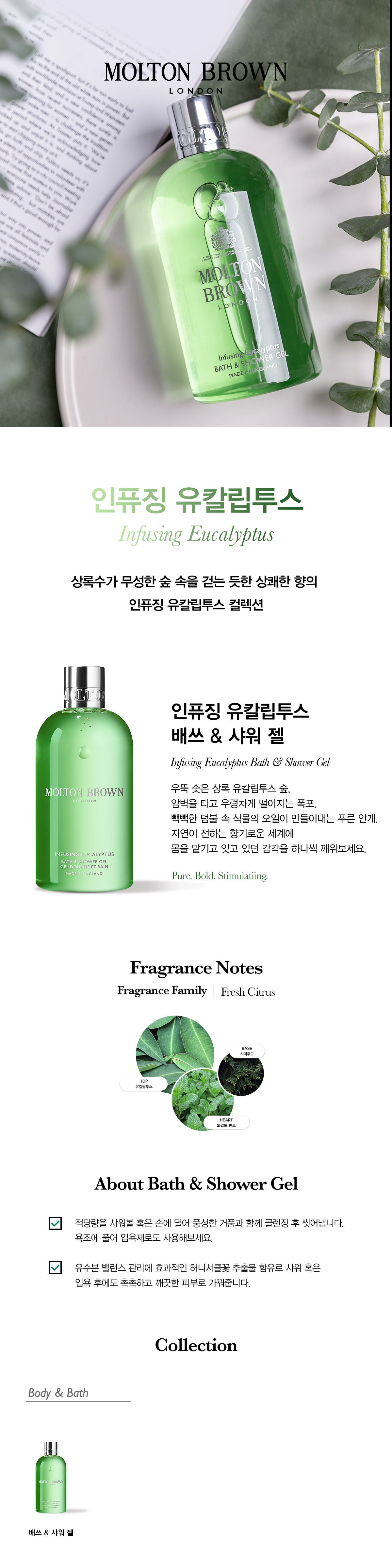| 모든 원료성분 | 정제수, 소듐라우레스설페이트, 코카미도프로필베타인, 프로필렌글라이콜, 향료, 글리세린, 소듐클로라이드, 코코-글루코사이드, 유칼립투스잎추출물, 폴리쿼터늄-7, 허니서클꽃추출물, 인동덩굴꽃추출물, 피이지-40하이드로제네이티드캐스터오일, 에칠헥실살리실레이트, 다이에틸헥실시링질리덴말로네이트, 부틸메톡시디벤조일메탄, 라우레스-7시트레이트, 쿠마린, 리날룰, 제라니올, 유제놀, 시트로넬올, 부틸페닐메틸프로피오날, 테트라소듐글루타메이트다이아세테이트, 토코페롤, 소듐파이테이트, 소듐벤조에이트, 시트릭애씨드, 소듐하이드록사이드, 피이지펜타에리스리틸테트라스테아레이트-150, 피피지-2하이드록시에틸코카마이드, 하이드로제네이티드팜글리세라이즈시트레이트 , 변성알코올, 황색4호, 녹색3호 |