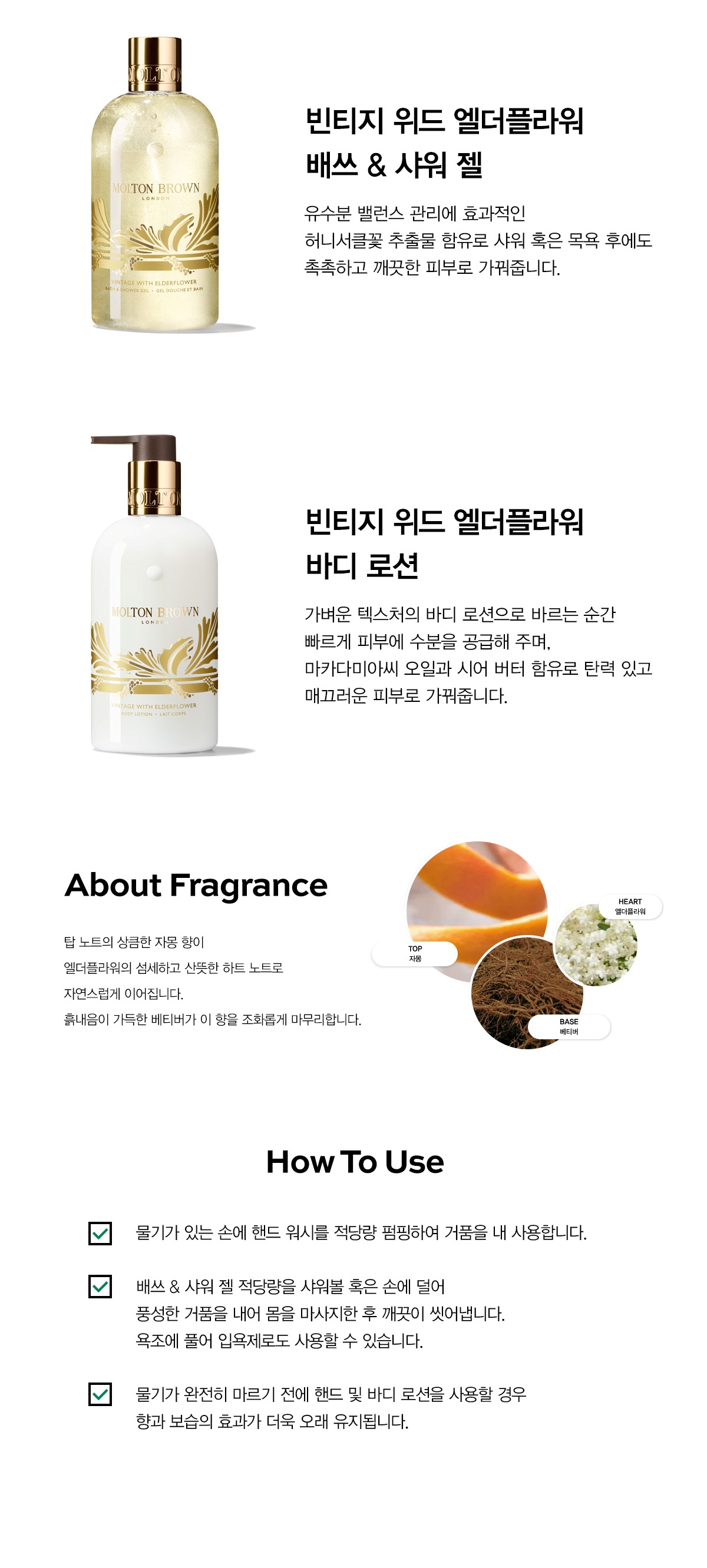 | 사용방법 | 배쓰 & 샤워 젤: 샤워 볼이나 스펀지에 적당량을 덜어 거품을 내어 클렌징 후 물로 깨끗이 씻어냅니다.바디 로션: 바디 피부에 마사지 하듯 골고루 펴 발라줍니다. |