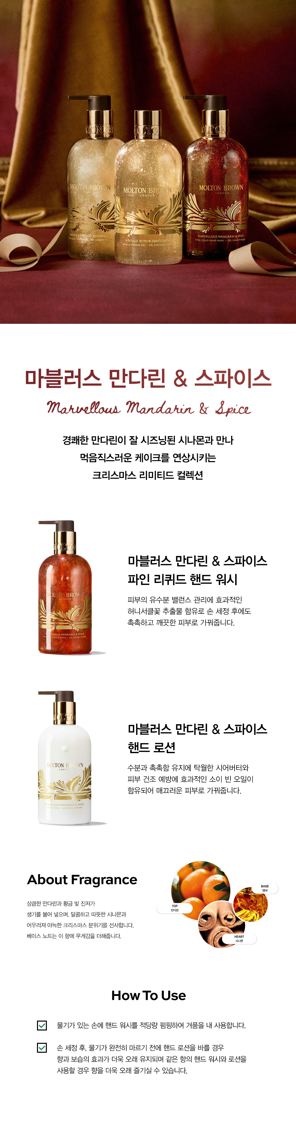 | 사용방법 | 파인 리퀴드 핸드 워시: 물기가 있는 손에 적당량을 펌핑하여 거품을 내 사용합니다. 같은 향의 핸드 로션과 함께 사용하면 향을 더욱 오래 즐기실 수 있습니다.핸드 로션: 손 세정 후, 물기가 완전히 마르기 전에 사용하시면 향과 보습의 효과가 더욱 오래 유지됩니다. 손등에 적당량을 덜어 가볍게 롤링해 바르세요. |