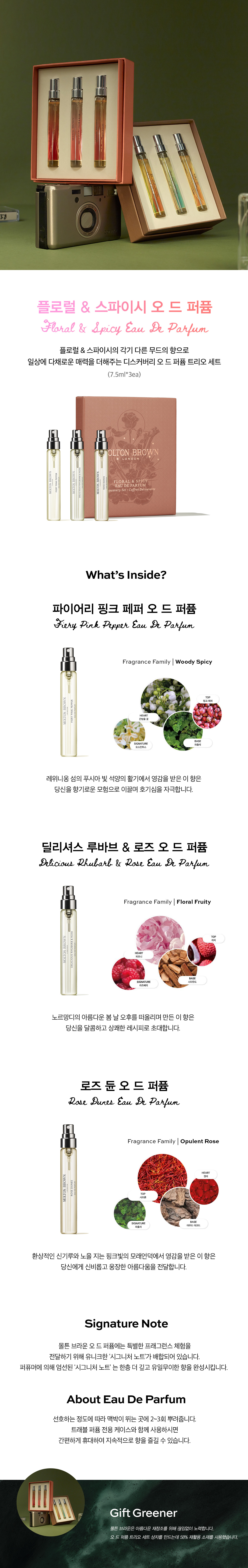| 모든 원료성분 | 파이어리 핑크 페퍼 오 드 퍼퓸: 변성알코올, 향료, 정제수, 하이드록시시트로넬알, 리모넨, 리날룰, 벤질살리실레이트, 시트랄, 헥실신남알, 제라니올, 시트로넬올, 알파-아이소메틸아이오논, 유제놀, 벤질벤조에이트, 벤질알코올 / 딜리셔스 루바브&로즈 오 드 퍼퓸: 변성알코올, 향료, 정제수, 알파-아이소메틸아이오논, 벤질알코올, 시트랄, 시트로넬올, 제라니올, 리모넨, 리날룰 / 로즈 듄 오 드 퍼퓸: 변성알코올, 향료, 정제수, 알파-아이소메틸아이오논, 시트랄, 시트로넬올, 쿠마린, 유제놀, 제라니올, 아이소유제놀, 리모넨, 리날룰, 메틸2-옥티노에이트 |