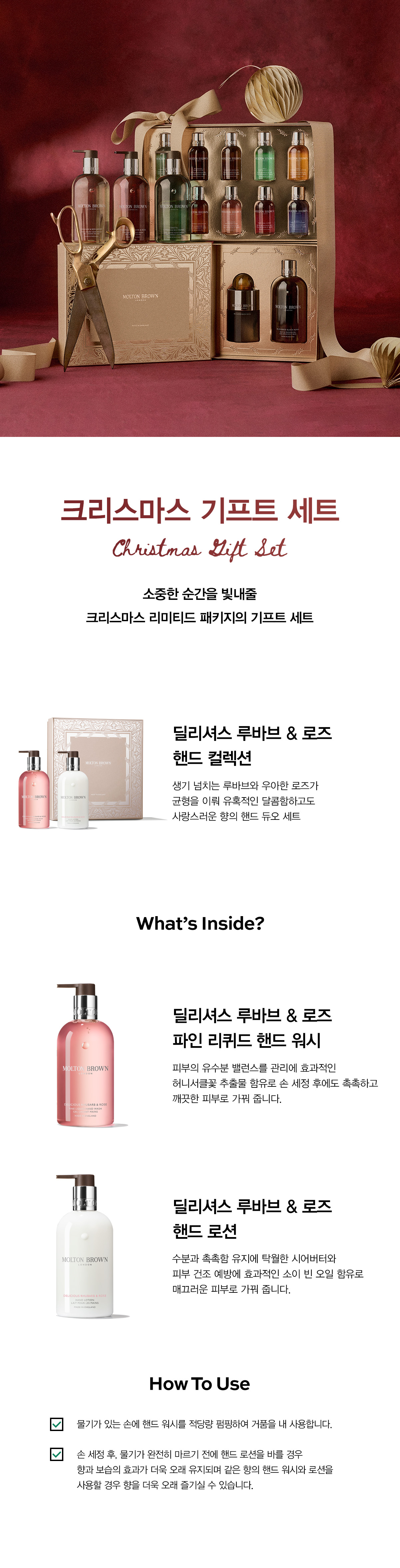 | 사용방법 | 파인 리퀴드 핸드 워시 : 물기가 있는 손에 적당량을 펌핑하여 거품을 내 사용합니다. / 핸드 로션 : 손 세정 후, 물기가 완전히 마르기 전에 사용하시면 향과 보습의 효과가 더욱 오래 유지됩니다. |
