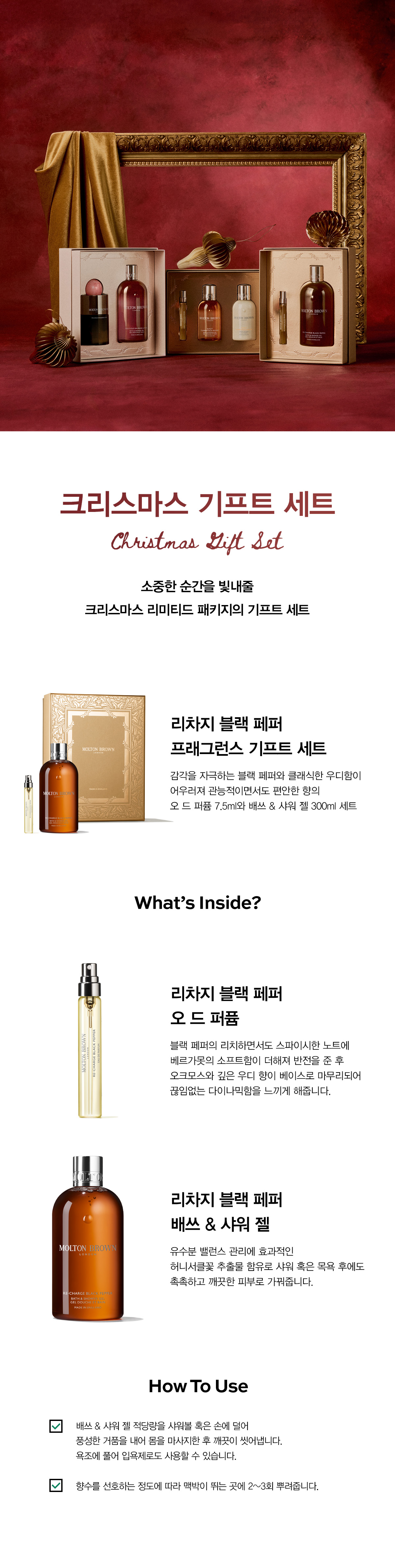 | 모든 원료성분 | (오드퍼퓸)변성알코올, 향료, 정제수, 리모넨, 시트랄, 시트로넬올, 쿠마린, 유제놀, 제라니올, 하이드록시시트로넬알, 리날룰 (배쓰&샤워젤)정제수, 소듐라우레스설페이트, 코카미도프로필베타인, 향료, 프로필렌글라이콜, 라우레스-7시트레이트, 코코-글루코사이드, 글리세린, 에칠헥실살리실레이트, 폴리쿼터늄-7, 테트라소듐글루타메이트다이아세테이트, 시트릭애씨드, 후추열매오일, 부틸메톡시디벤조일메탄, 다이에틸헥실시링질리덴말로네이트, 피이지-150펜타에리스리틸테트라스테아레이트, 소듐하이드록사이드, 피피지-2하이드록시에틸코카마이드, 토코페롤, 소듐벤조에이트, 청색1호, 적색504호, 시트랄, 시트로넬올, 쿠마린, 하이드록시시트로넬알, 리모넨, 리날룰 |